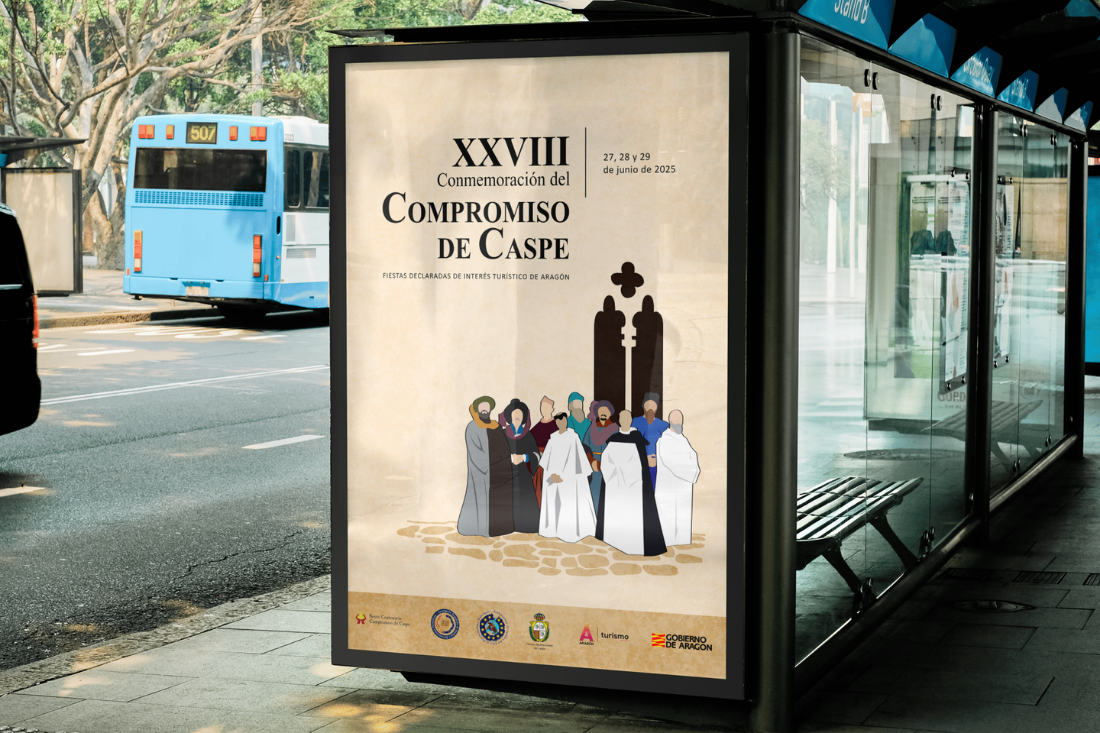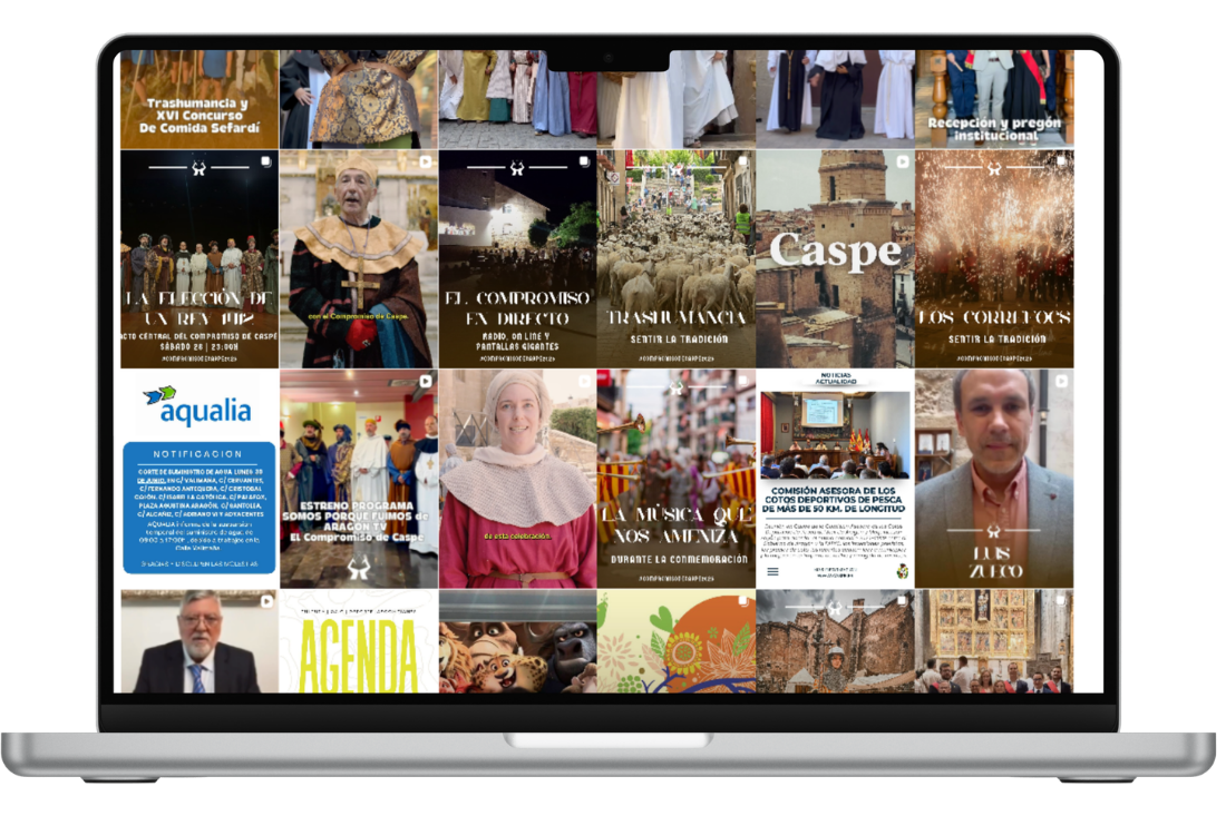 Desde 2024 y 2025 gestionamos las redes institucionales y la estrategia de comunicación digital de la Conmemoración del Compromiso de Caspe, evento histórico organizado por el Ayuntamiento de Caspe.